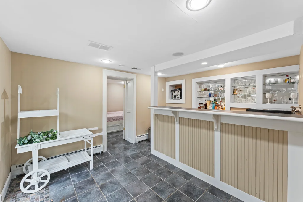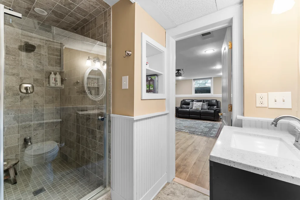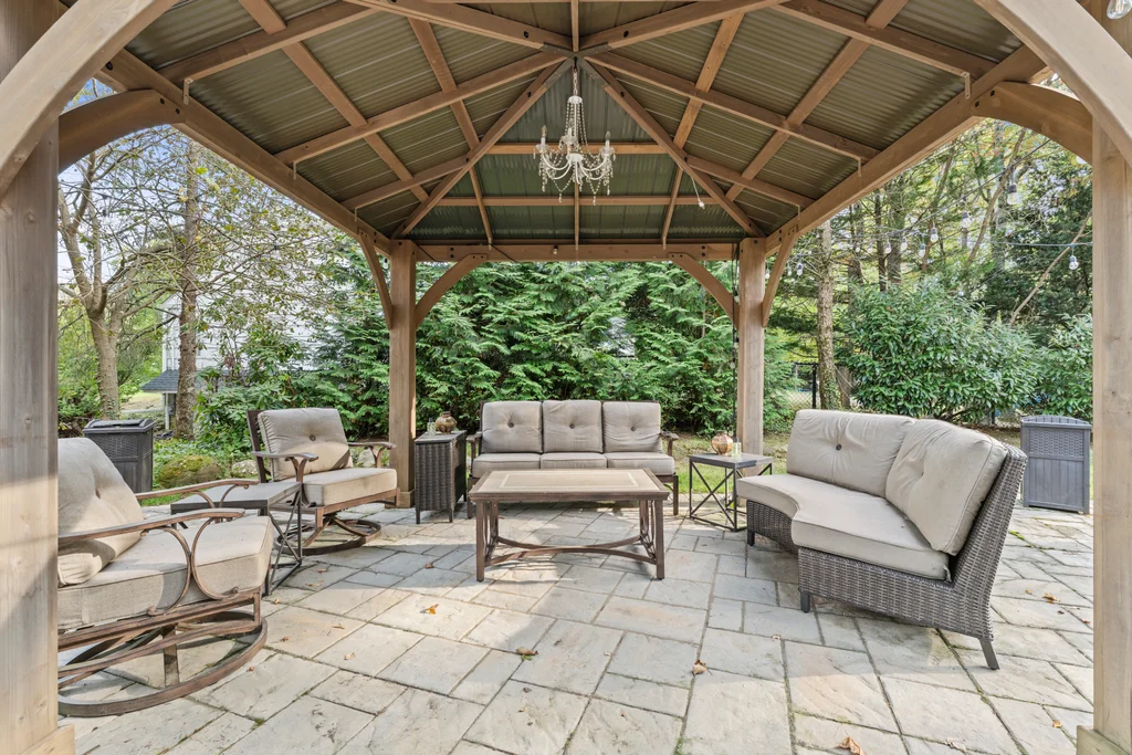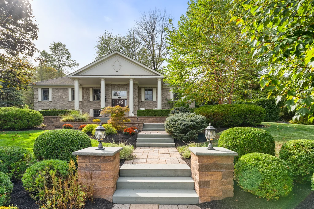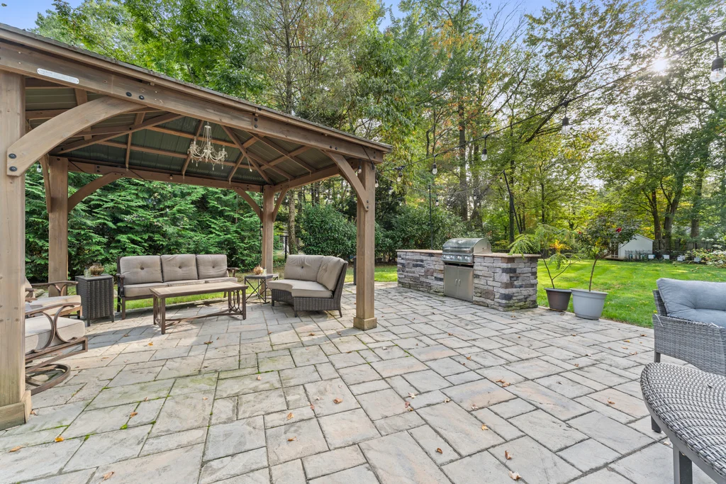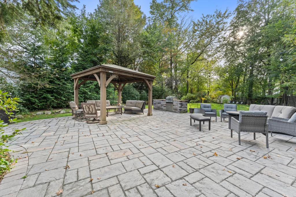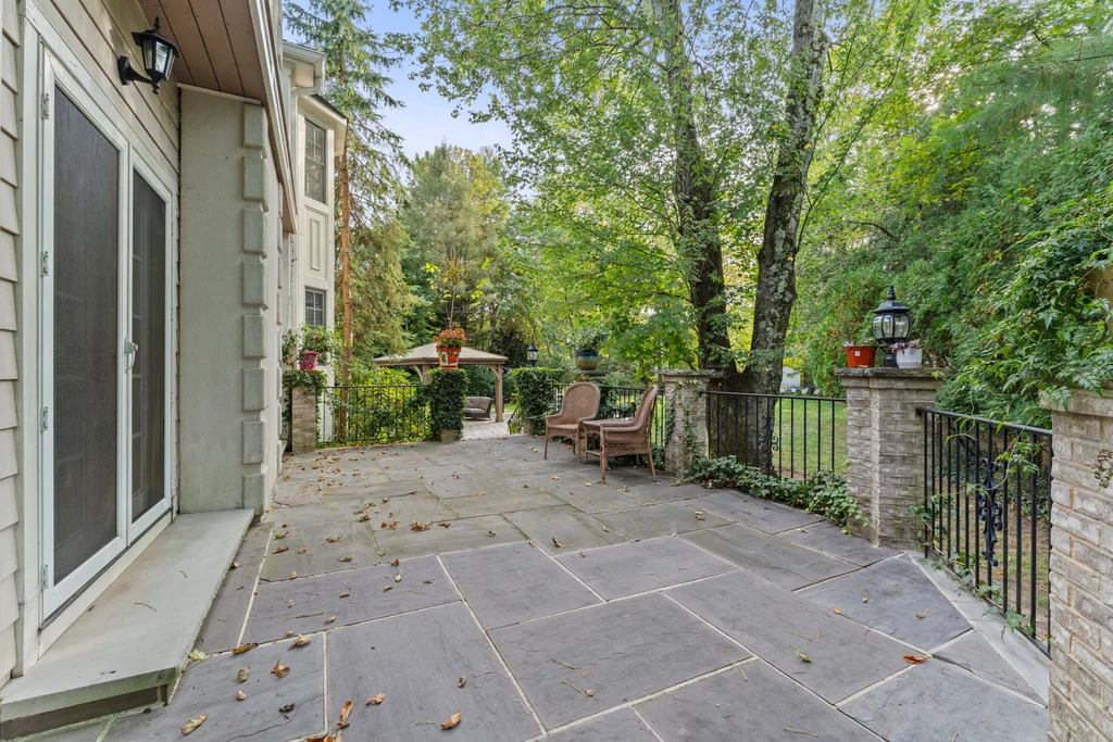 The lower level is a true entertainer’s retreat, featuring a full bar, additional full bath, laundry, and a flexible space ideal for a nanny’s quarters, gym, or guest suite. With direct walk-out access to the expansive, park-like grounds, the residence invites seamless indoor-outdoor living. A two-tiered stone patio provides the perfect setting for al fresco entertaining, play, or quiet enjoyment of the surrounding natural beauty.