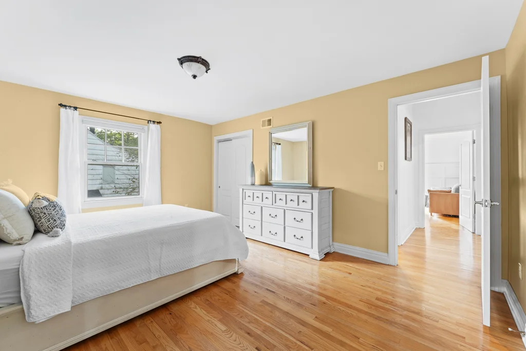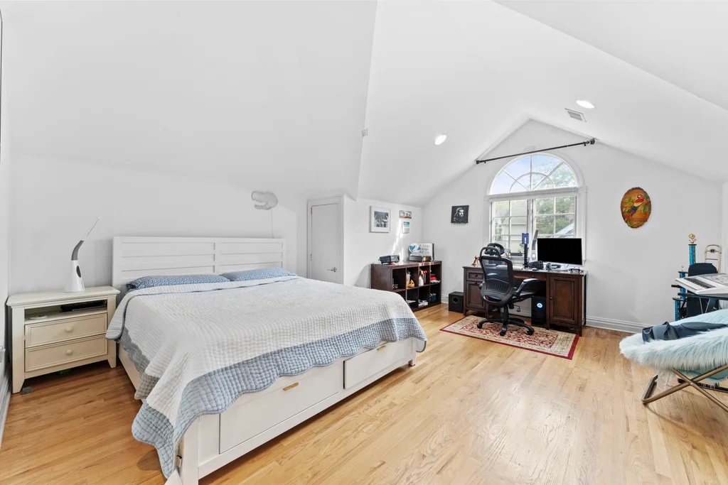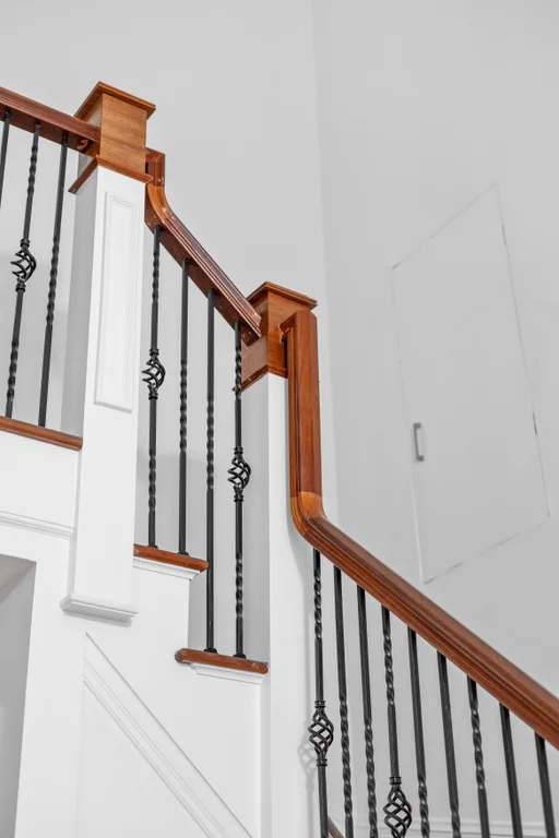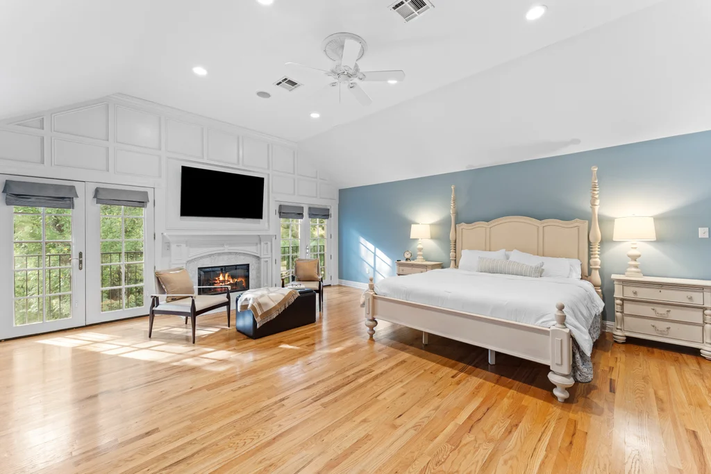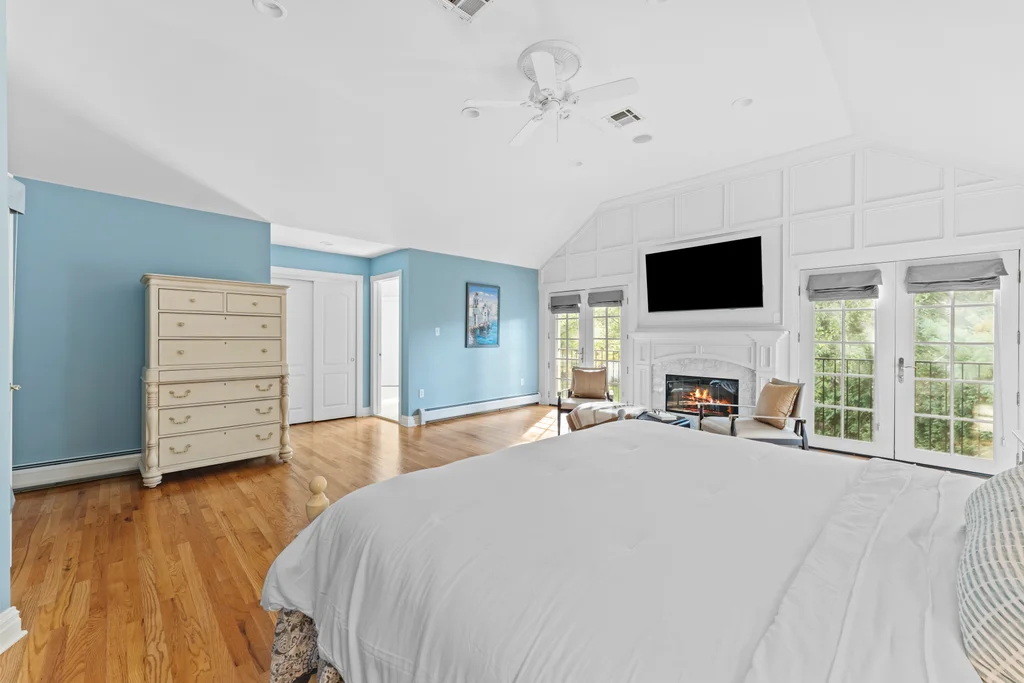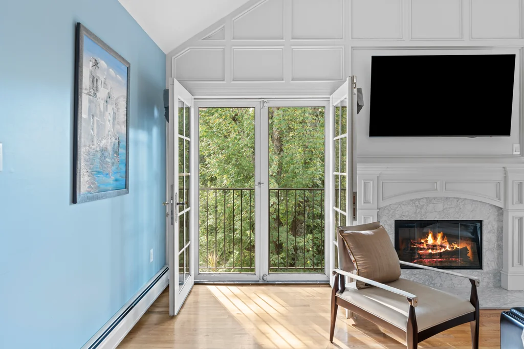 The primary suite offers a private sanctuary on its own level, complete with two Juliette balconies, a custom walk-in closet, and a spa-inspired bath that epitomizes luxury and relaxation.