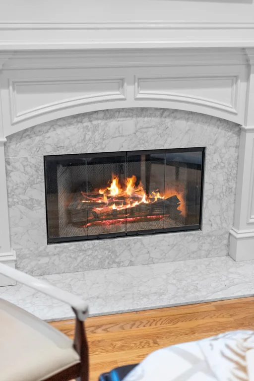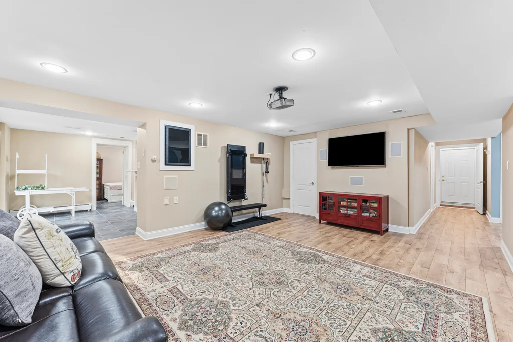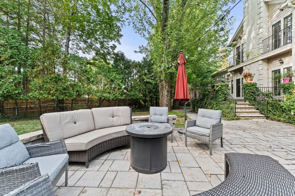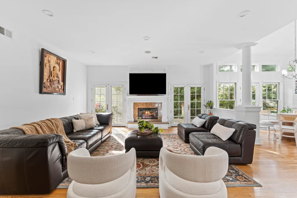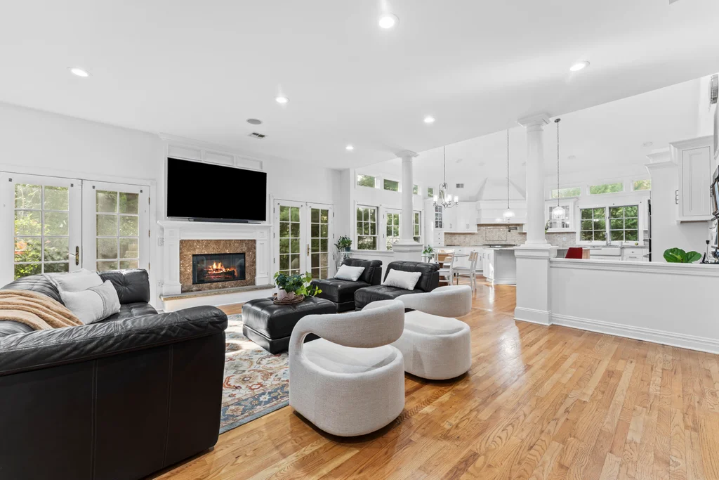 The main level showcases a 2020 chef’s kitchen outfitted with premium Sub-Zero and Viking appliances, an expansive center island, and seamless flow into the open-concept living and dining areas. Thoughtful enhancements such as integrated speakers and a gas fireplace set a warm, inviting tone, ideal for both intimate gatherings and lively entertaining.